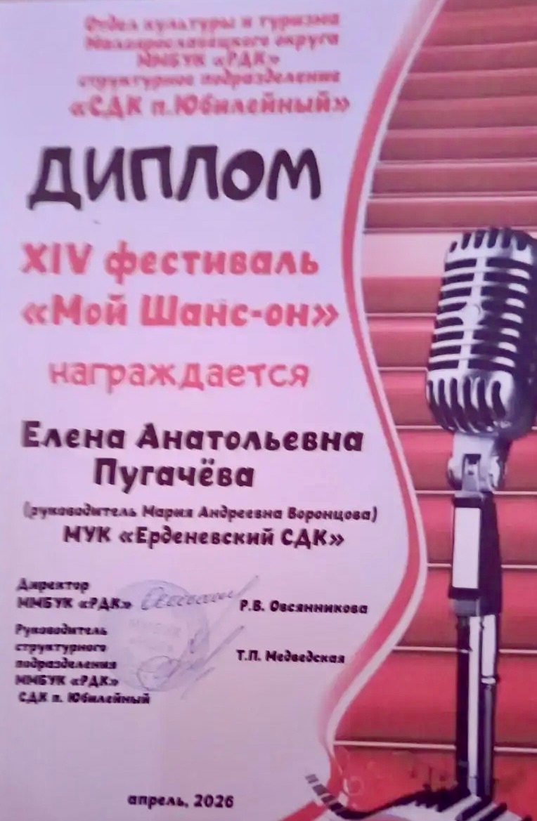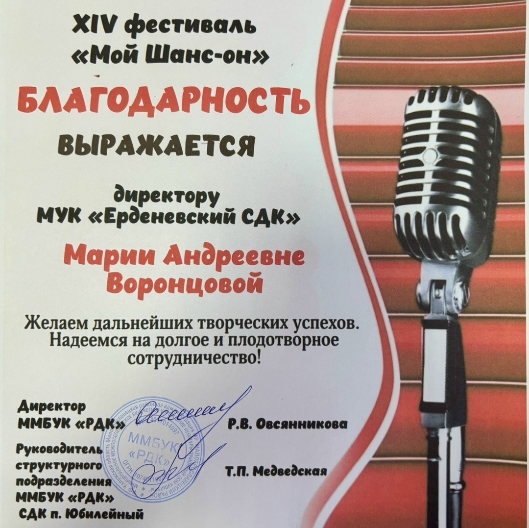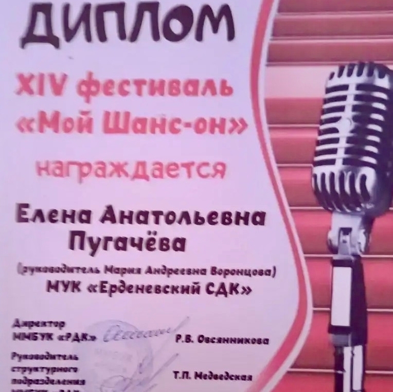 «Сегодня был интересный опыт! От нашего МУК "Ерденевский СДК" участвовала в замечательном фестивале "Мой шанс-он" СДК посёлка Юбилейный. Очень душевная была атмосфера! Большая благодарность всем организаторам! И конечно благодарю Марию Андреевну Воронцову,которая руководила подготовкой меня к этому Фестивалю, а также сотрудника нашего ДК Ивана Антипова за сопровождение и фото/ видеосъёмку!!!»